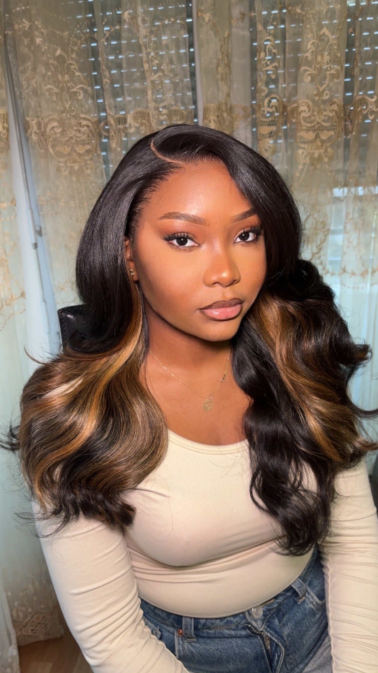 Avec ses longueurs ondulées et son contraste subtil entre le brun profond et les mèches caramel, elle offre un look sophistiqué, lumineux et ultra moderne.